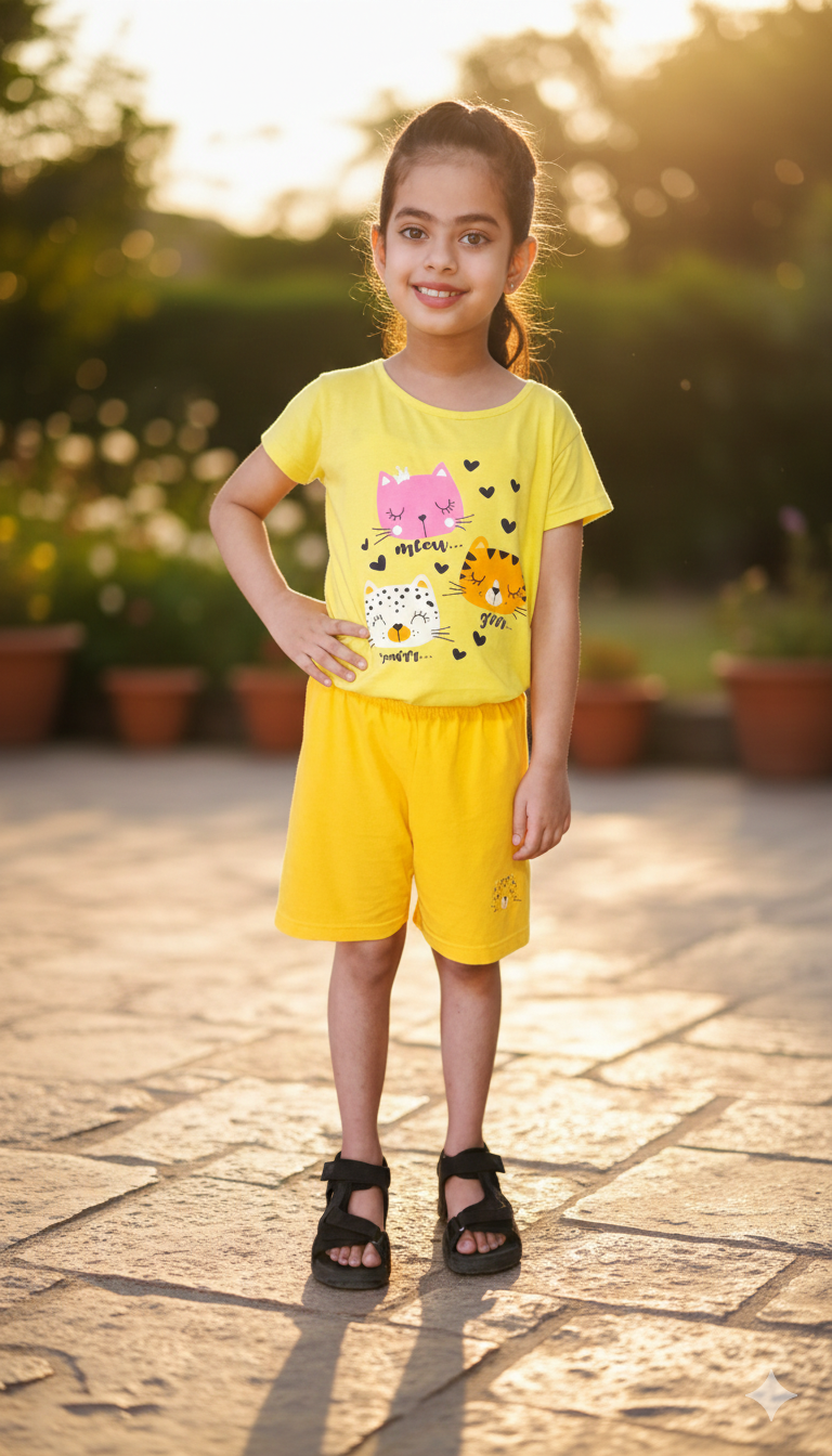 A Yellow T-shirt and shorts set for kids offers comfort and style for everyday wear. Perfect for playtime, it keeps kids cool and active all day long. It's typically made of cotton or a cotton blend, offering comfort and breathability.