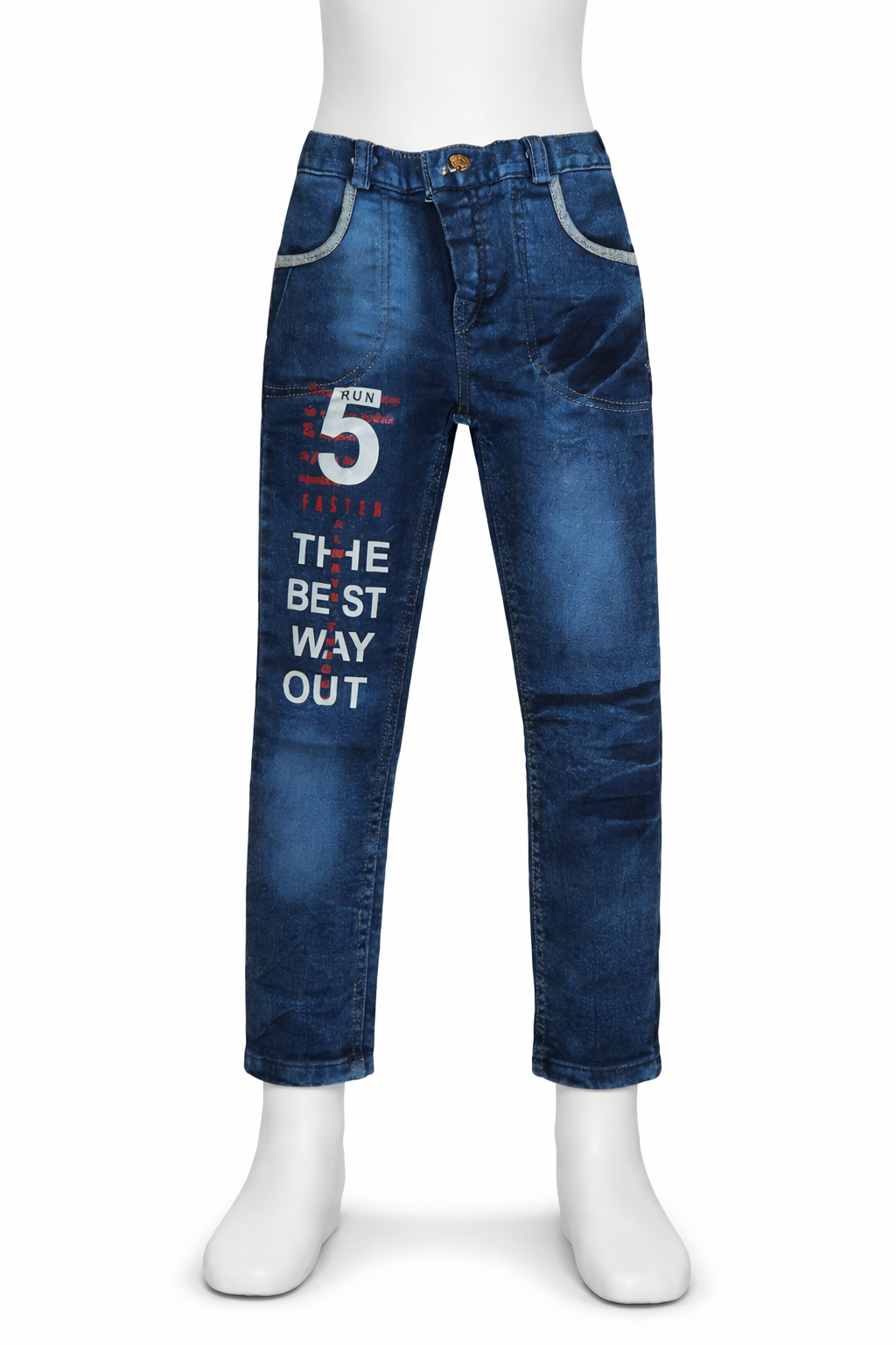 Upgrade your boy’s everyday style with these trendy blue denim jeans featuring bold printed graphics on the leg. Designed with a modern washed finish, these jeans offer a perfect mix of comfort, durability, and cool street-style appeal. The eye-catching “RUN 5 – THE BEST WAY OUT” print adds a sporty and energetic vibe, making them great for casual outings, playtime, or daily wear.